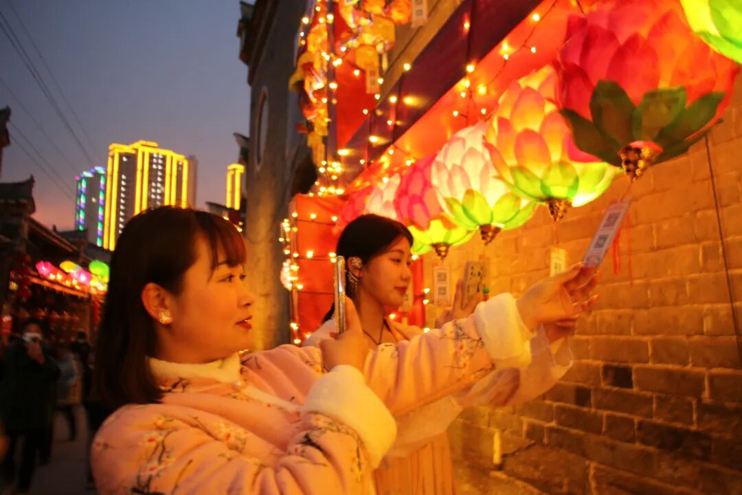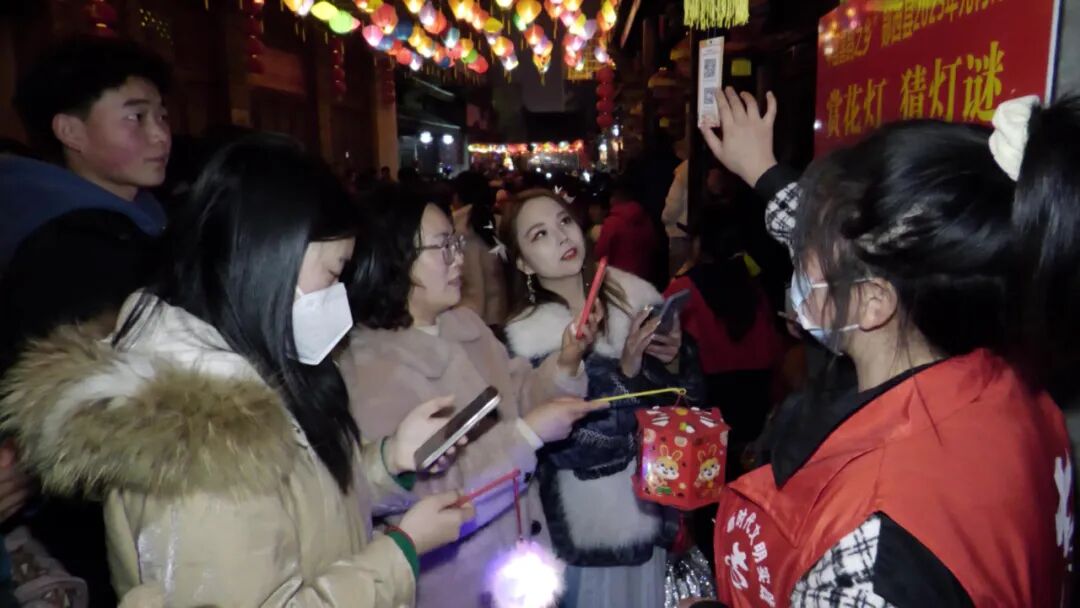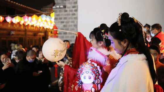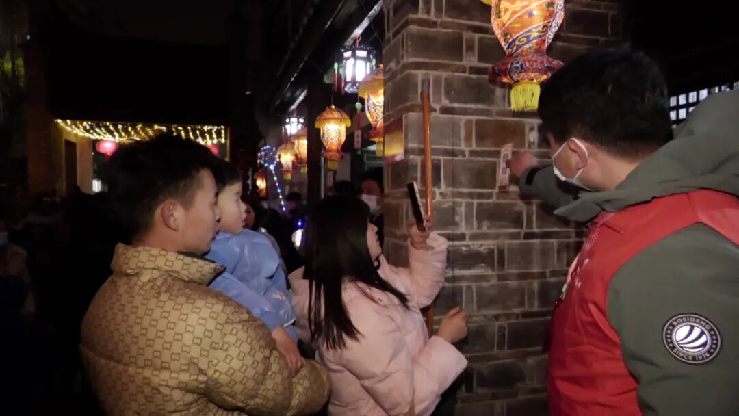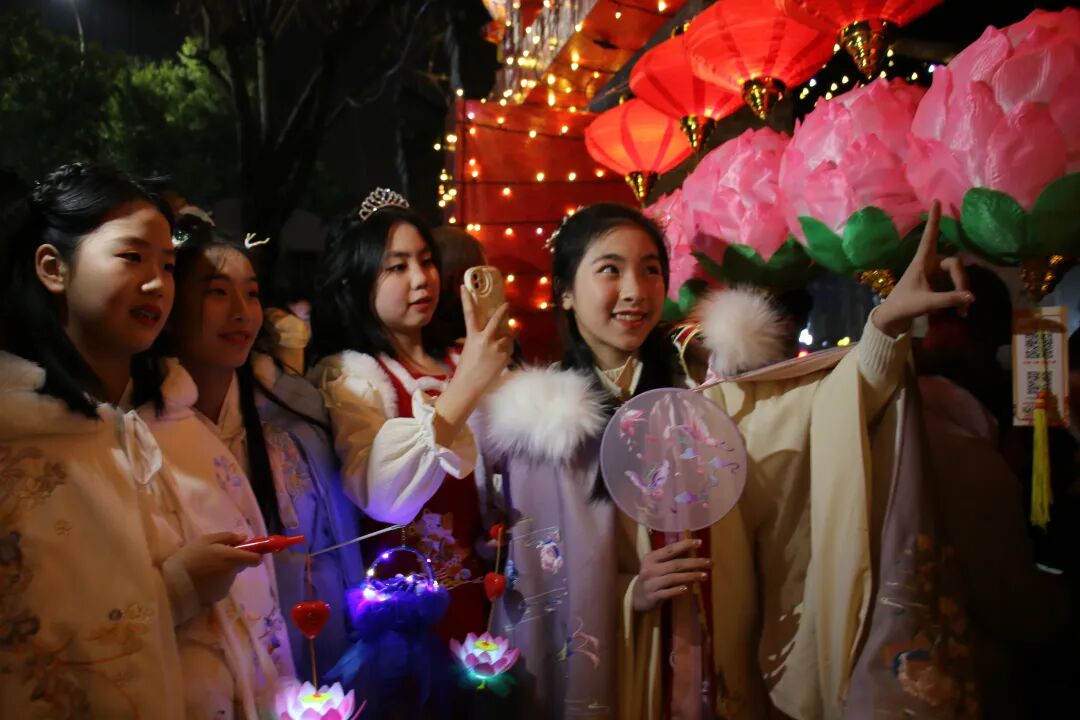 不少市民朋友身着汉服拿着各种造型独特的花灯吸引游客驻足围观