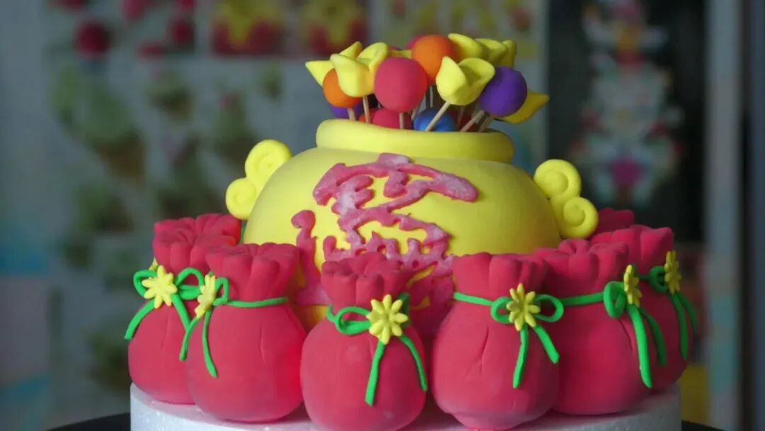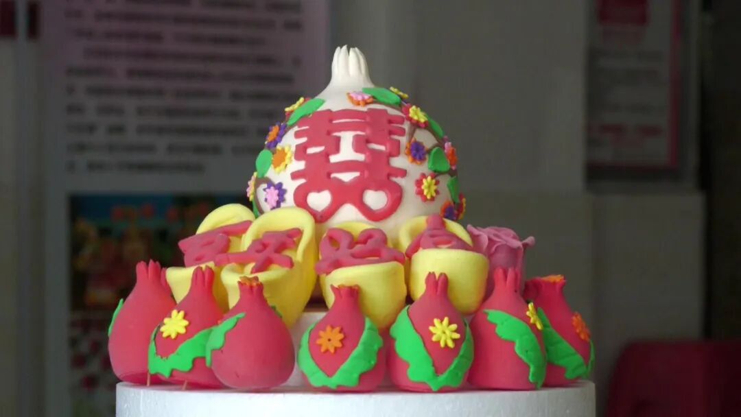 “这个花馍蛋糕是目前订单数量较多的一款,这个福袋的寓意是福气满满、代代有福,上面的聚宝盆,寓意着财气。这种石榴花馍蛋糕结婚用的多,订单也挺好,一般定的话就是一层或者是两层的,这个石榴它的寓意比较好,就是多子多福,像老人过生日,或者年轻人结婚,用这种石榴的比较多。”卢芸一一介绍道。