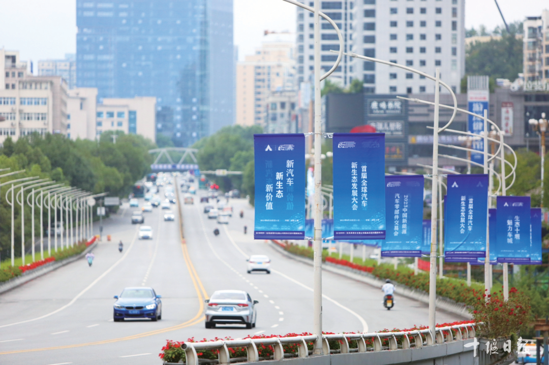 9月18日,记者在北京路万达广场附近看到,工人们正沿路在灯杆上悬挂旗帜。据悉,从9月17日开始,我市在高铁十堰东站、武当山机场、北京路沿线等处布设宣传标语、条幅、宣传展板、灯杆旗等,为即将在十堰举行的首届汽车新生态发展大会暨2023中国新能源汽车零部件交易会营造良好氛围。