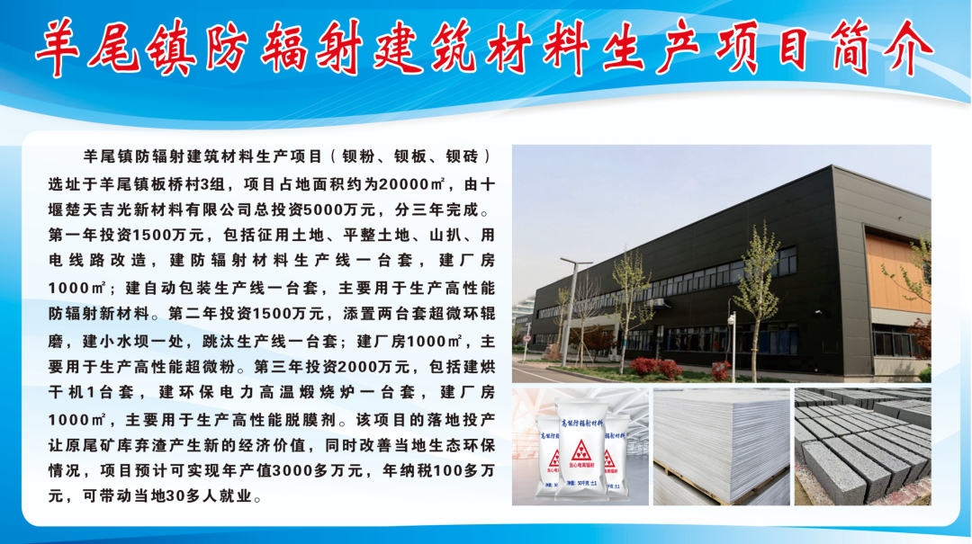 羊尾镇防辐射建筑材料生产项目,占地面积约20000平方米,由十堰楚天吉光新材料有限公司投资建设,总投资5000万元,该项目落地投产后可以让羊尾矿库弃渣产生新的经济价值,同时改善当地生态环保情况,预计可实现年产值3000多万元,年创税100多万元,带动当地30多人就业。