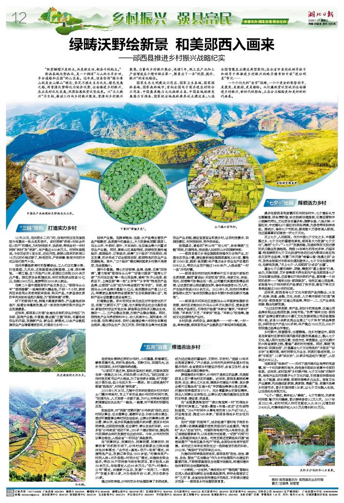 1月17日,《湖北日报》第12版《乡村振兴 强县富民》栏目,刊登了《绿畴沃野绘新景 和美郧西入画来——郧西县推进乡村振兴战略纪实》讲述新时代的郧西合力描绘更加美好时代画卷的有效路径.