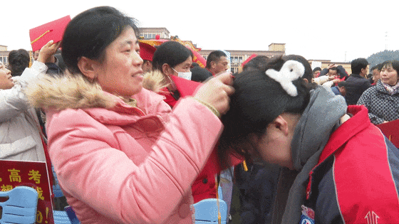 十八而立承大任,在学校为高三学生举行18岁成人礼中,家长为孩子戴上成人帽,学生面向父母、师长鞠躬行礼,感谢父母的养育之恩老师的授业之情。