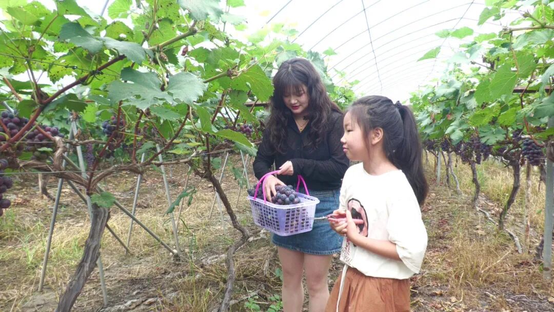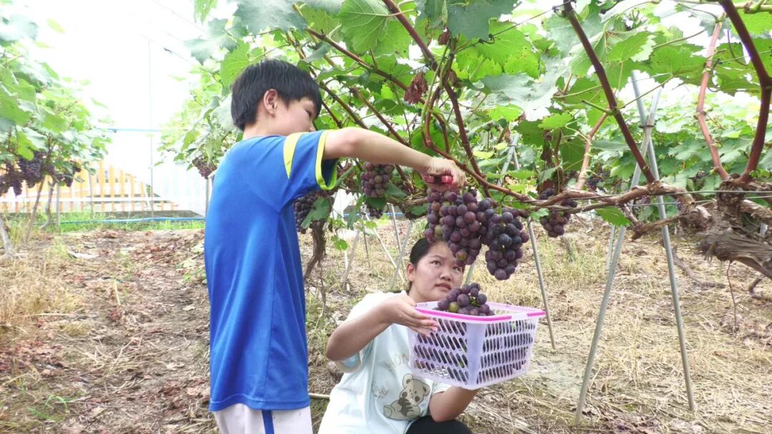 走进采摘园,清新的果香扑鼻而来,绿意盎然的枝蔓下,一串串红如玛瑙、紫如水晶的葡萄挂满枝头,让人垂涎欲滴。游客们拿着剪刀、提着果篮,穿梭在葡萄架下,挑选心怡的葡萄。“这里的葡萄口感很好,每年夏天都会带孩子来这里采摘,体验田园生活的乐趣。”游客们边采摘边开心的说道。