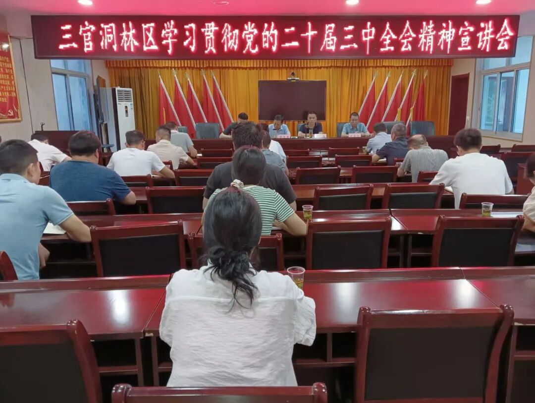 深学细悟、融会贯通,全面系统“深入学”。三官洞林区党委组织党员干部认真学习全会精神,坚持读原著、学原文、悟原理,在学懂、弄通、做实上狠下功夫。采用“集中学+自主学”“线上+线下”相结合,依托“主题党日”“理论中心组学习”等方式,通过村民微信群、电子屏,推送会议要点思维导图、专家权威解读视频,对学习心得进行交流分享。同时,班子成员带头深入各村,围绕全会的重大意义、习近平总书记的重要讲话精神,以通俗易懂的语言向群众宣讲党的二十届三中全会精神。当前,累计开展学习15场次,受教育党员干部群众1000余人。