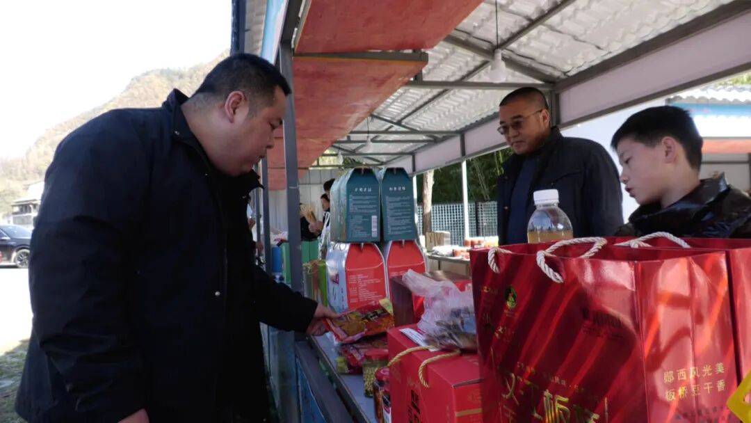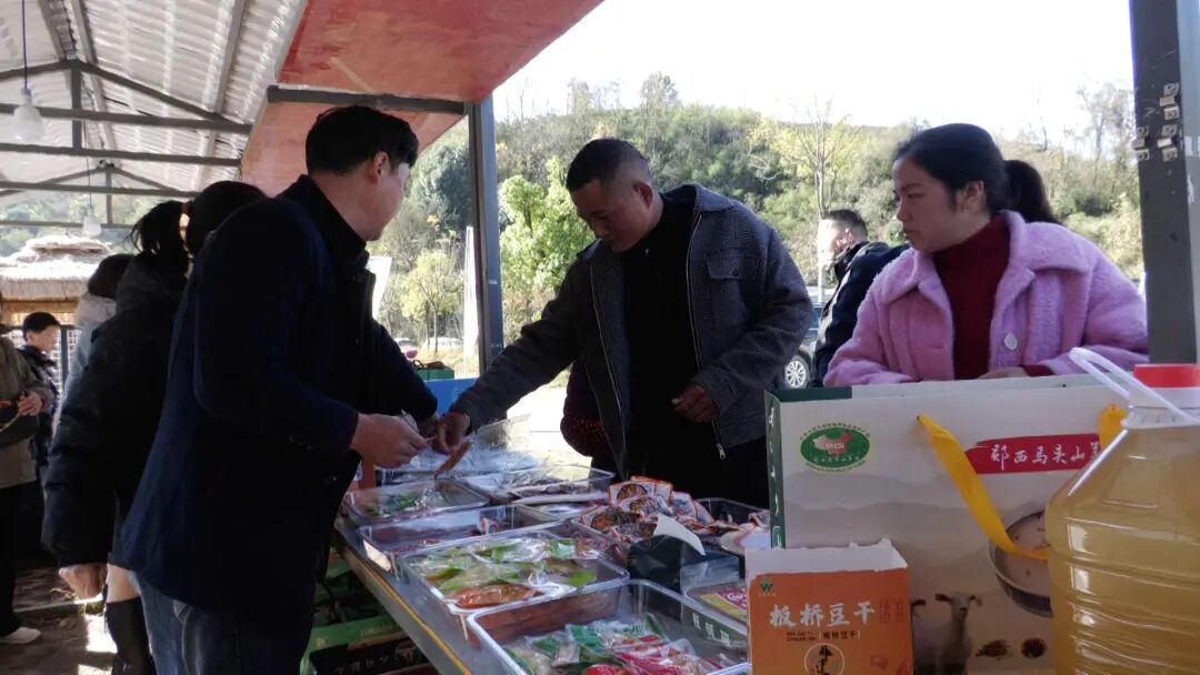 在商品展销现场,来自两县三地的柿子酒、木瓜酒、蜂蜜、茶叶红薯粉条、豆腐干、花生、麻辣酱等农副产品,在展区依次摆开吸引不少游客和市民驻足购买。