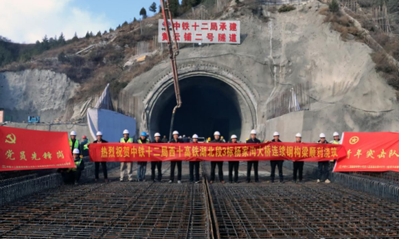 12月17日,西十高铁湖北段XSZQ-3标二分部承建的杨家沟双线钢结构连续梁大桥顺利开盘浇筑。