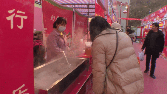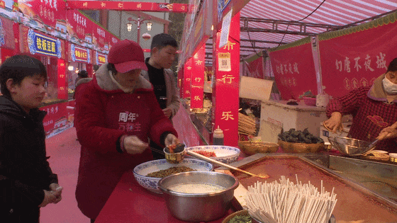 除了丰富的商品展销,羊尾镇还精心引入了国潮美食集市。龙潭水街摇身一变,成为了一个集国潮视觉、美食市集、网红打卡、网红美食与网红游乐于一体的美食集市嘉年华。来自鄂陕两省多地的游客和群众络绎不绝,他们在此品尝不同风味美食,体验各种游乐项目,购买特色产品,观看传统民俗表演,感受浓郁的年味。