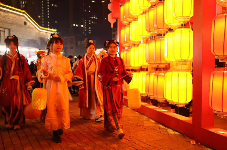 璀璨绚丽、五彩斑斓的灯笼高高地挂在街区两侧的长廊上,仿佛美轮美奂的灯海,迎接着每一位前来感受年味的人。一群身穿华丽汉服的姑娘们穿梭在花灯之间,她们衣袂飘飘、笑容明媚,引得不少市民游客驻足围观。大人、小孩子们提着各式各样的花灯,互相拍照留念,一片欢声笑语。“今天专门做了古装造型,来老北街品尝了花馍、看了三弦表演,还有猜灯谜活动,感受到了浓浓的节日氛围。”市民陈敏开心地说道。