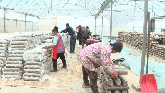 2月20日,在河夹镇强河蔬菜生产专业合作社香菇菌棒养棒车间,合作社理事长王恕明正带领七八名工友对香菇菌棒进行转场翻堆。