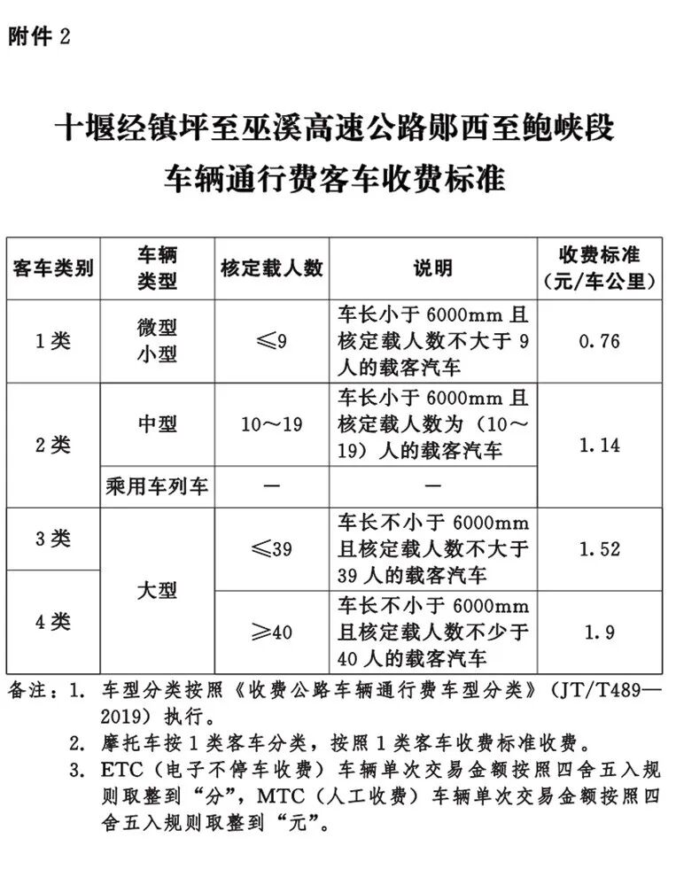 按照《收费公路管理条例》和湖北省有关规定,十堰经镇坪至巫溪高速公路郧西至鲍峡段车型分类收费标准按1类客车0.76元/车公里档,1类货车0.6元/车公里档执行。收费期暂定30年,自通车收费之日起计算。