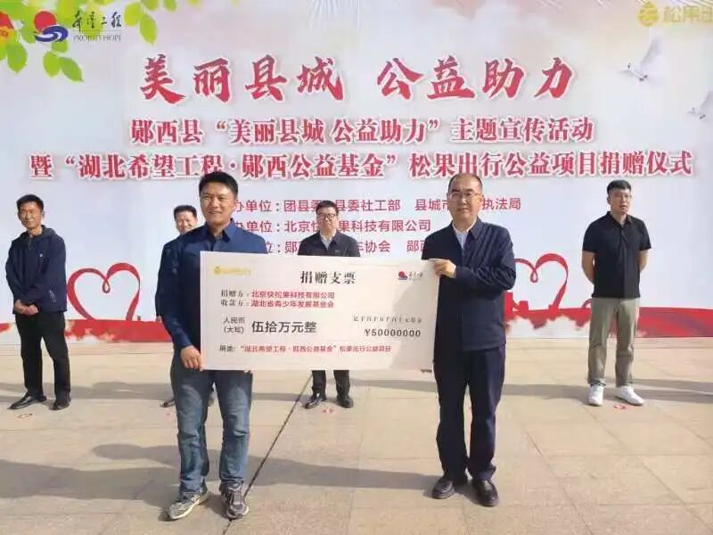 活动中,北京快松果科技有限公司向我县希望工程捐赠50万元支票,用于“湖北希望工程·郧西公益基金”松果出行公益项目。