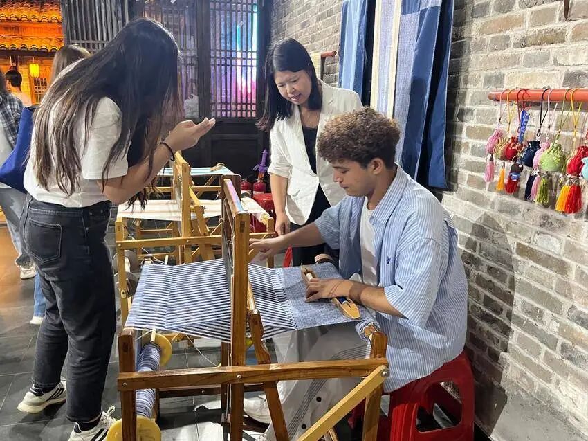 图为郧西县手织布技艺非遗传承人邱敬晓正在引导外国游客学习手织布技艺。郧轩文摄