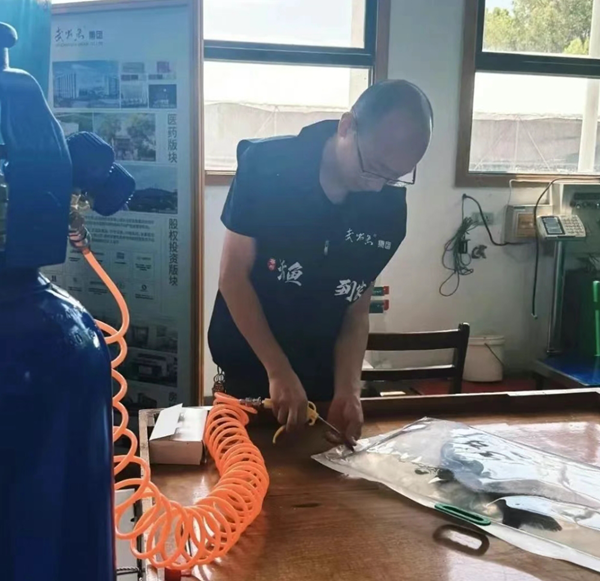 工作人员给装着武昌鱼的包装袋注氧、密封