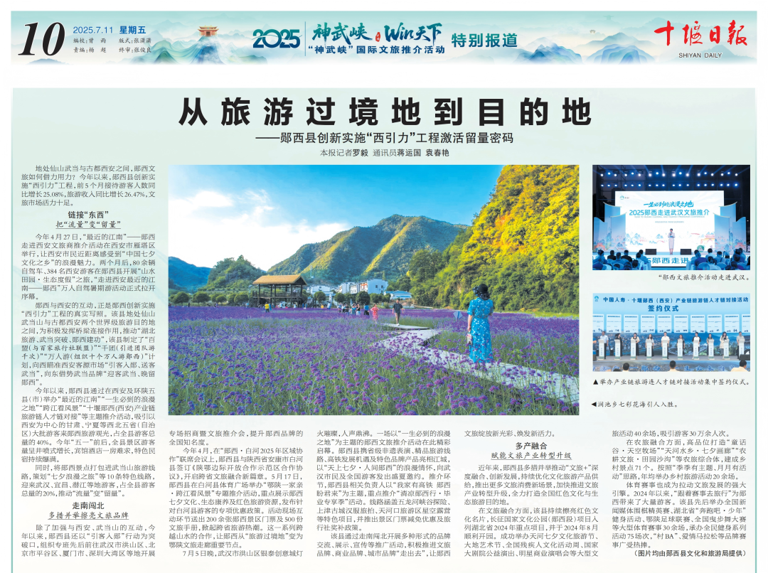 7月11日,《十堰日报》A10版刊发《从旅游过境地到目的地——郧西县创新实施“西引力”工程激活留量密码》聚焦郧西借力用力,实现文旅市场活力十足。