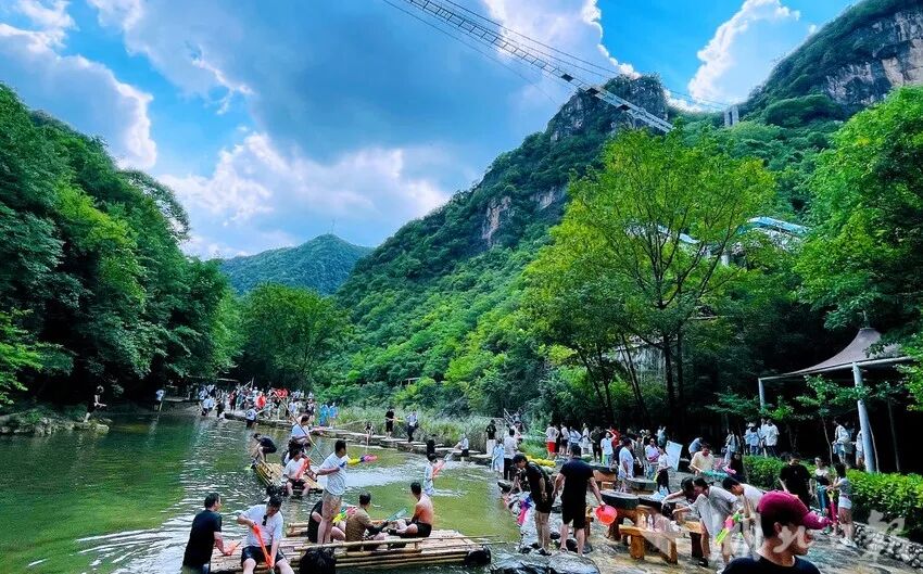 “受七夕与暑期叠加效应影响,目前景区日均接待游客已超1500人次,已累计接待旅行团近百个。”五龙河景区工作人员肖燕介绍,“织女谷”景点最受青睐,游客在此沉浸式感受牛郎织女爱情传说,参与民俗互动、拍照打卡,现场欢声笑语不断。为应对客流高峰,景区不仅增派人员、强化安全保障,还推出七夕祈福、篝火晚会等特色活动,全方位提升游客体验、烘托节日氛围。