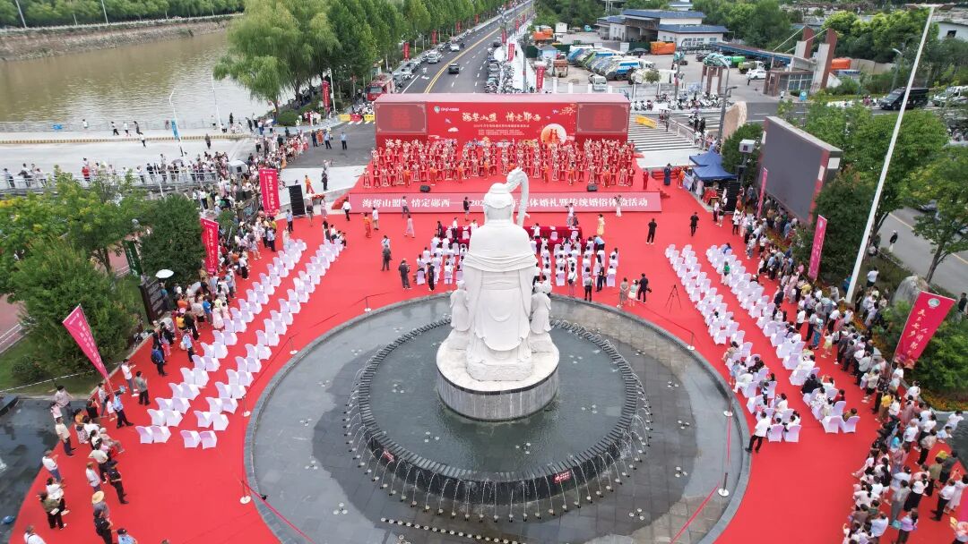 伴随着悠扬的音乐,一场集体婚礼拉开了系列活动的帷幕,77对新人身穿传统的中式婚服执手相牵、缓缓入场,古韵十足的仪式定格爱情最美模样。