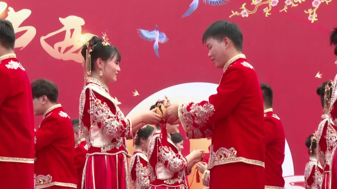 青年集体婚礼中,77对新人行三拜礼、结发礼、合卺礼。