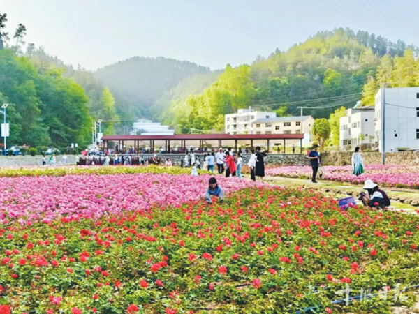 梁家沟村月季花竞相绽放,与错落有致的民居、蜿蜒的村道相映成趣。