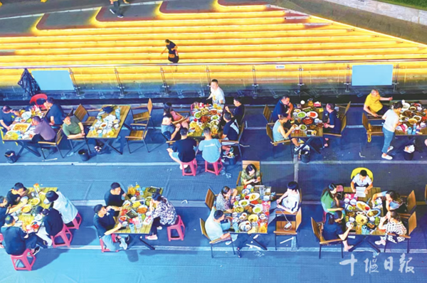 9月20日晚,华灯初上。位于张湾区汉江路街道的阳光栖谷天街烟火氤氲、人流如织,千余米街市霓虹闪烁;1.2公里外的万达金街车水马龙、活力涌动,夜经济与商圈经济在此交相辉映。
