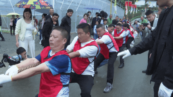 拔河比赛现场,随着裁判一声令下,6支代表队的选手们紧握绳子,双脚用力蹬地,身体后倾,使出浑身解数,拼命往后拉,大家互相鼓励,绝不放弃,呐喊声加油声声声入耳。