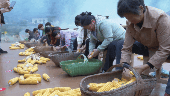 随着游客陆续汇聚而来,拔河、剥玉米、割稻谷比赛在家竹村任家湾同步开展。