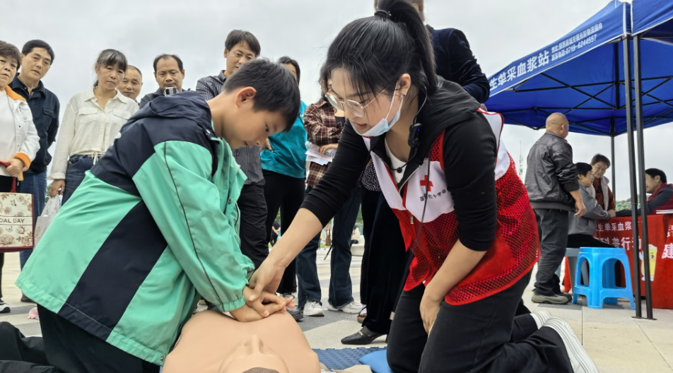 县红十字会联合县医院同步开展健康义诊与急救知识普及活动,志愿者详细展示仰头举颌、开放气道、人工呼吸、复原体位等心肺复苏操作流程,大大提升了居民的自救互救能力。