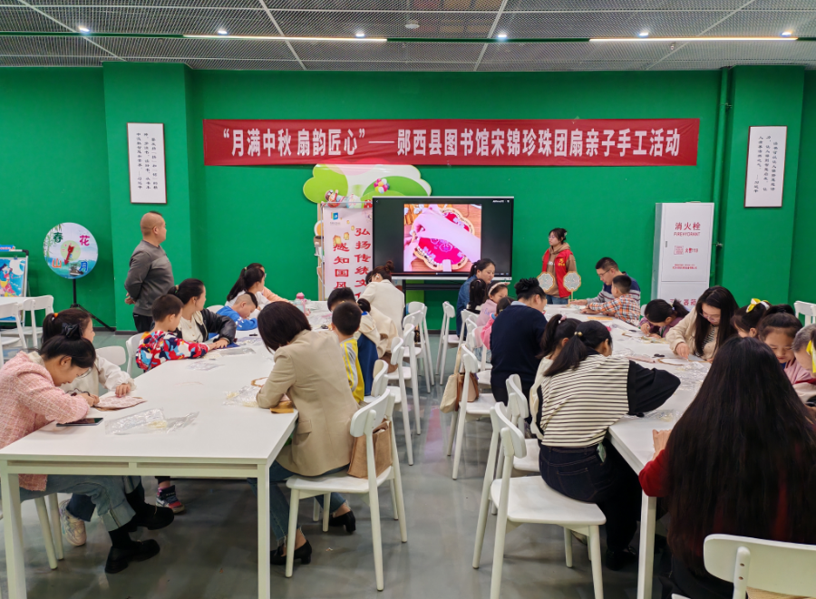 “月满中秋 扇韵匠心”宋锦珍珠团扇亲子手工活动中,在老师的耐心指导下,家长与孩子们沉浸式体验宋锦珍珠团扇制作技艺,合力制作出独具匠心的中秋团扇。