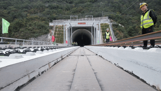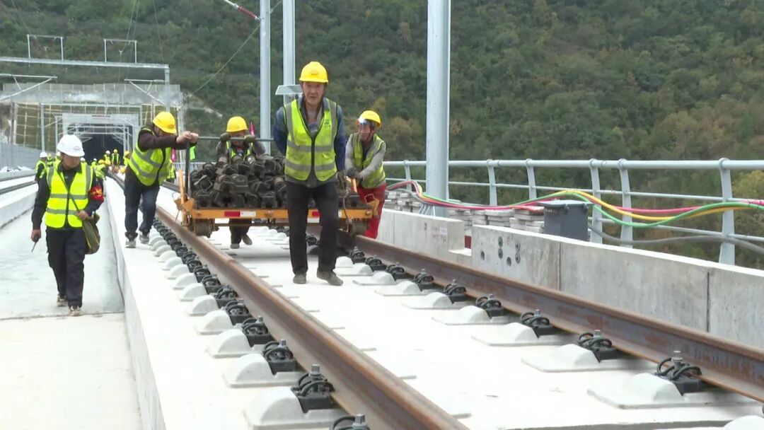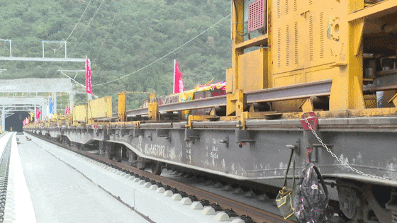 此次铺轨,施工单位共投入了2套铺轨机组和3组长轨运输车,投入200余名施工人员,克服连续穿越密集长大坡道及隧道交通不便难题,每次铺轨拖拉500米长钢轨,预计每天铺设8公里,确保铺轨任务按期完成。