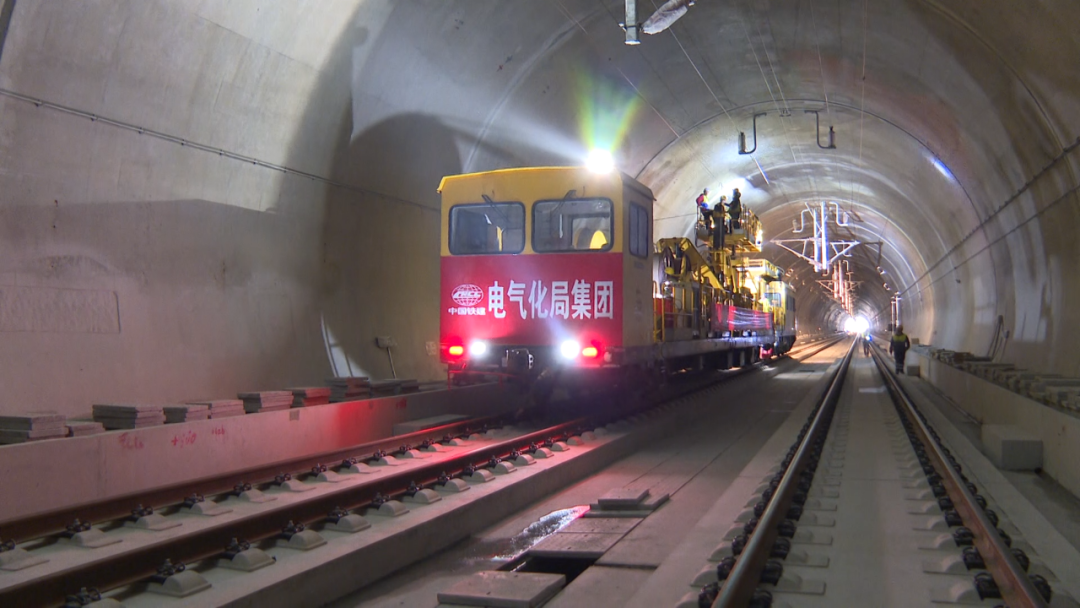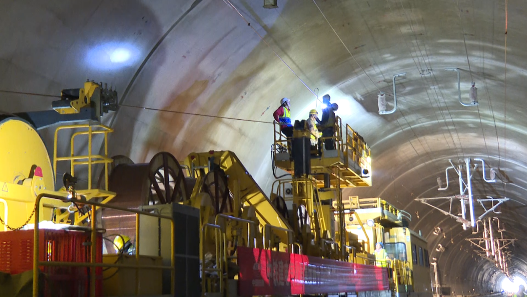 当天,经过近60分钟的紧张作业,中国铁建电气化局团队顺利完成首条1.25条公里的接触线架设任务。