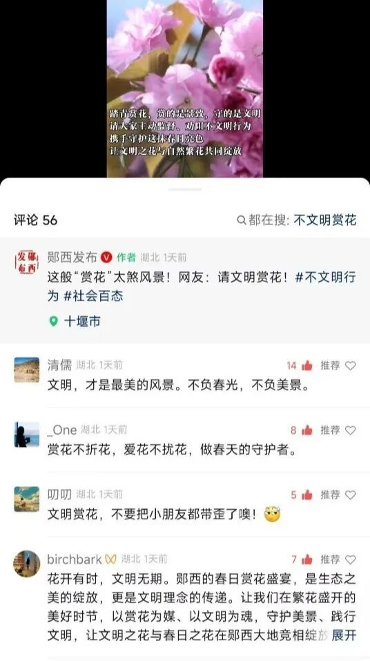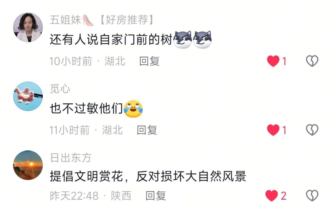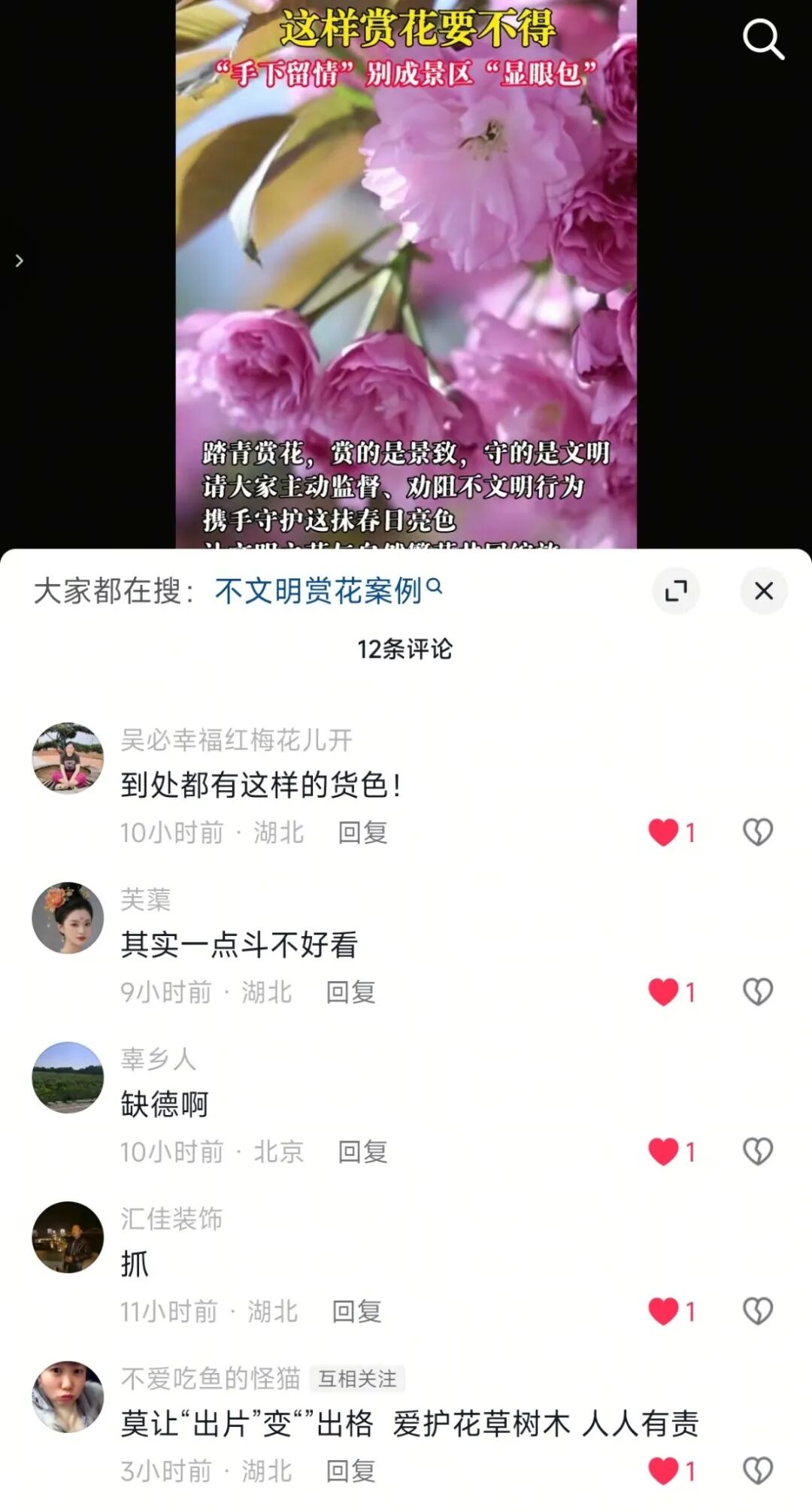 看似唯美的“花瓣雨”,实则是对公共景观的破坏。春日的花枝十分脆弱,随意摇晃极易导致花枝折断、花朵早谢,既损害了公共利益,影响了其他市民的赏花体验。一张出圈的照片、一段好看的视频背后,丢掉的是个人的文明素养,也扫了其他市民的赏花兴致。